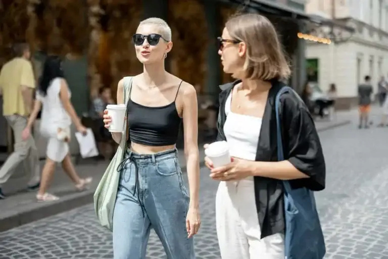 Δύο γυναίκες απολαμβάνουν καφέ και συζήτηση σε καλοκαιρινή βόλτα στο κέντρο της πόλης, συμβολίζοντας την ελευθερία από το άγχος υγείας μέσω κοινωνικών δραστηριοτήτων και χαλάρωσης μετά από ομοιοπαθητική θεραπεαί στην Αθήνα
